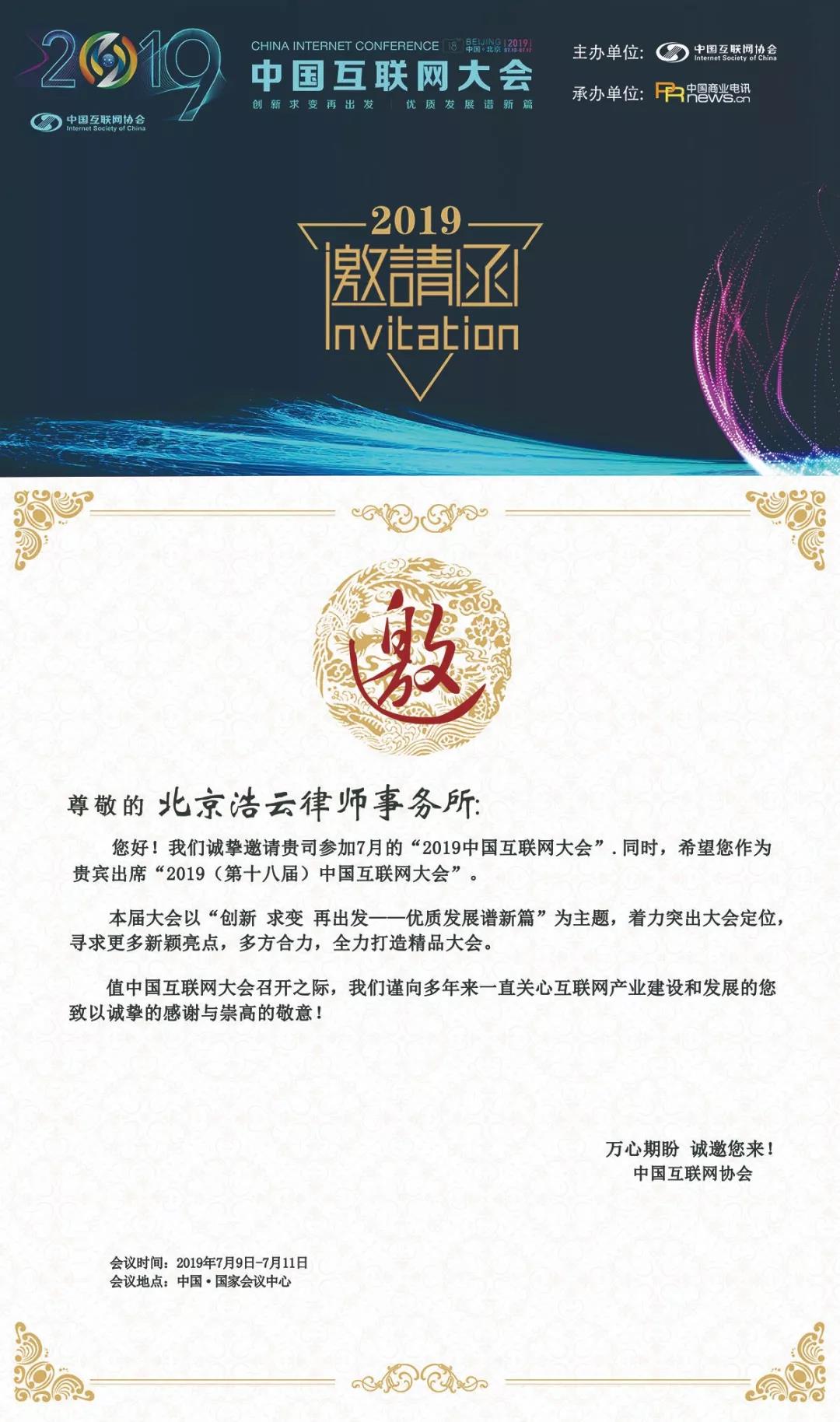 北京浩云律師事務(wù)所受邀出席2019第18屆中國互聯(lián)網(wǎng)大會